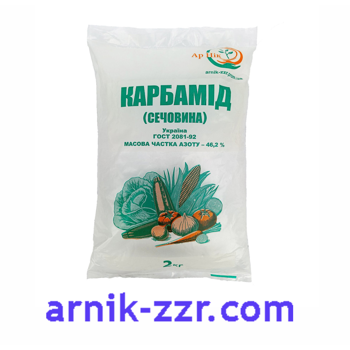 Карбамід N-46.2 (сечовина) CO(NH2)2 – це концентроване азотне добриво, яке відноситься до категорії універсальних. Дрібнокристалічний продукт білого кольору, до складу якого входить не менше 46,2% азоту. Рекомендується застосовувати як добриво чи підживлення для всіх сільськогосподарських культур. Прекрасно розчиняється у воді. Сечовина є одним із найефективніших добрив, що містять азот, який активно стимулює та сприяє росту рослин. Особливості застосування: Його застосовують як основне добриво при посіві технічних та зернових культур. Також карбамід використовують для овочевих та плодових культур, а також квітів та декоративних культур. Добриво вносять перед посівом. Карбамід показує високу ефективність при обприскуванні зернових та інших культур. Карбамід є безпечним азотним добривом, не викликає опіків листя. Застосовується на всіх типах ґрунту як основне добриво та як у вигляді підживлення. Його застосування значно підвищує рівень урожайності. Норми внесення: Пшениця, ячмінь, жито, ріпак — 1,5 — 2 кг на сотку, внесення — основні (перед сівбою); Бобові та кормові буряки 2-3 кг на сотку – основні (перед сівбою); Морква, цибуля, капуста, помідори — 15-30 г на 1м2 – основні (перед сівбою); Картопля, цукрові та кормові буряки, кукурудза — 1-1,5 кг на сотку, внесення — підживлення (норма внесення одне); Плодові та овочеві культури, ягідники, квіти — 10 г на 1м2, внесення — підживлення (норма внесення одне); Всі культури — 30-80 г на 10 г води — обприскування водним розчином в період вегетації. Особливості використання карбаміду: одноразове внесення не повинно перевищувати 2,5 кг на сотку, карбамід потрібно заривати в ґрунт, тому що втрати при поверхневому внесенні сягають до 30%.